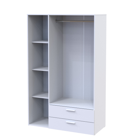 шафа містить три відділення: відділення з двома висувними шухлядами, відділення зі штангою для вішалок та відділення з полицями |