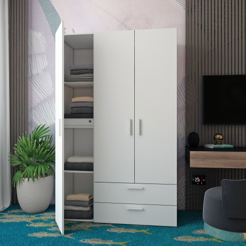 Шафа Ектор 3 ДСП Doros - це практичне і зручне рішення для організації простору і зберігання речей. Кожне відділення виконує свою функцію, забезпечуючи зручність використання та порядок у домі: відділення з двома висувними шухлядами, ідеально підходить для зберігання дрібних предметів, як-от білизна, аксесуари, документи, або інші дрібниці, що мають бути під рукою, висувні шухляди забезпечують легкий доступ до речей і допомагають уникнути безладу; відділення зі штангою для вішаків, прекрасно підходить для зберігання одягу, що вимагає вертикального розміщення, як-от костюми, сукні, пальта, сорочки, штанга для вішаків дає змогу акуратно розмістити одяг, що не вимагає вертикального розміщення, а саме: костюми, плаття, пальта, сорочки, штанга для вішалок дає змогу акуратно розвішувати одяг, запобігаючи його зім'яттю та забезпечуючи порядок у гардеробі; відділення з полицями, ідеальне для зберігання складеного одягу, взуття, коробок із сезонними речами, книжок або інших предметів, які можна зручно розмістити на полицях, полиці допомагають раціонально використовувати простір і забезпечують зручний доступ до потрібних речей. Шафа Ектор Doros стане чудовим вибором для спальні, передпокою або гардеробної, допомагаючи підтримувати порядок і ефективно використовувати простір.