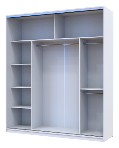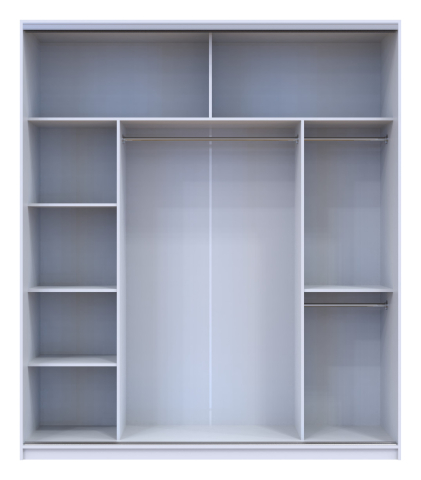 шафа містить чотири відділення - відділення з полицями та три відділення зі штангою для вішалок, зверху розташовані полиці антресоль |