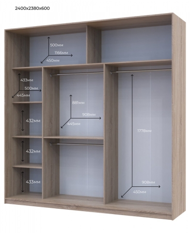 Шафа-купе Сіті 24 238/60 Doros стане одним із найкорисніших і функціональних предметів меблів, дозволивши максимально раціонально використовувати наявний простір. Містка і простора шафа у своїй конфігурації має чотири відділення - відділення з полицями та три відділення зі штангою для вішалок, зверху розташовані полиці антресоль, для зручного зберігання речей, а також обладнана алюмінієвою профільною розсувною системою відкриття дверей з високими характеристиками міцності. Шафа-купе City 24 Doros стане справжньою знахідкою, дозволивши розподілити всі речі по своїх місцях і максимально звільнити життєвий простір.