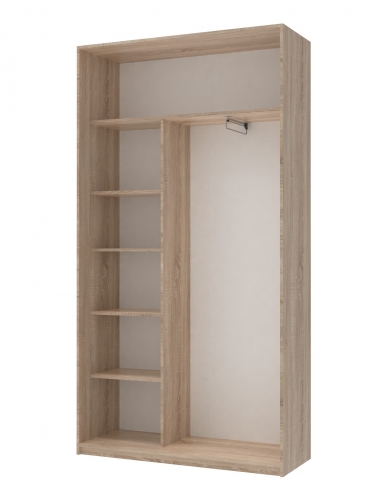 шафа містить два відділення - відділення з полицями та відділення з висувною штангою для вішалок, зверху розташована полиця антресоль |