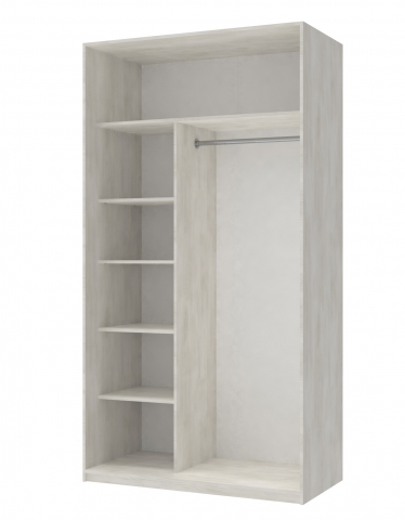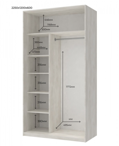 шафа містить два відділення - відділення з полицями та відділення зі штангою для вішалок, зверху розташована полиця антресоль |