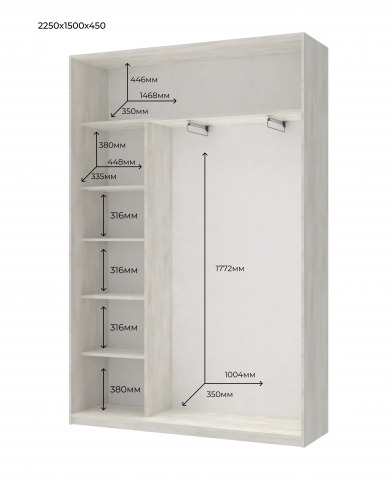 шафа містить два відділення - відділення з полицями та відділення з двома висувними штангами для вішалок, зверху розташована полиця антресоль |