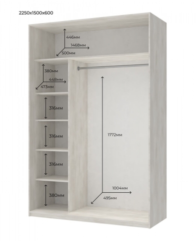 шафа містить два відділення - відділення з полицями та відділення зі штангою для вішалок, зверху розташована полиця антресоль |