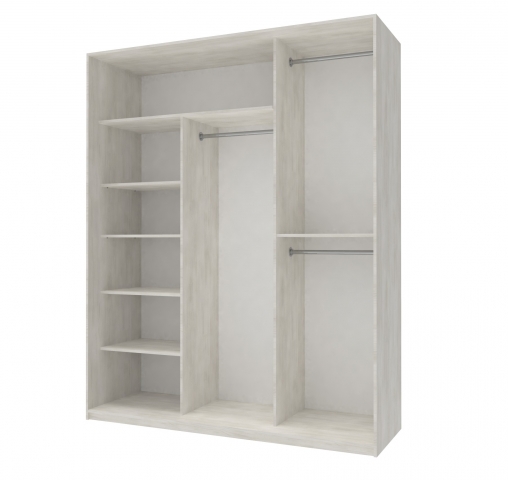 шафа містить чотири відділення - відділення з полицями та три відділення зі штангою для вішалок, зверху розташована полиця антресоль |