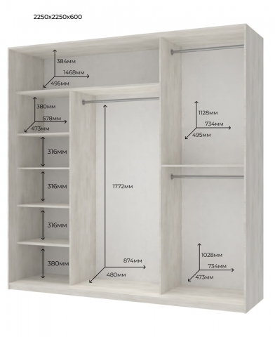 шафа містить чотири відділення - відділення з полицями та три відділення зі штангою для вішалок, зверху розташована полиця антресоль |