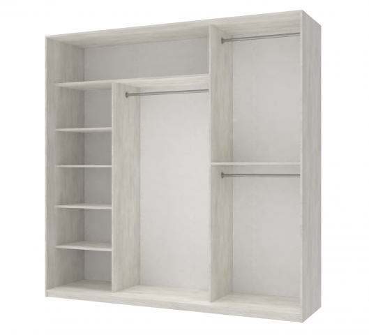 шафа містить чотири відділення - відділення з полицями та три відділення зі штангою для вішалок, зверху розташована полиця антресоль |