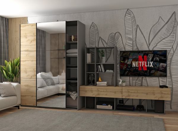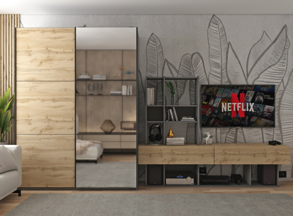 Шафа-купе G-Caiser Doros – це невід'ємна і функціональна складова сучасного інтер'єру спальні чи вітальні, гардеробної кімнати або передпокою, для створення «правильного планування» та зберігання речей. Перевагою шафи є два відділення: відділення з полицями та відділення зі штангою для вішалок, зверху полиці антресоль з німецькою розсувною системою Hettich та один дзеркальний фасад Leal Glass в повний зріст. Шафа-купе G-Caiser Doros безсумнівно, стане модним, функціональним і практичним предметом меблів в зоні Вашого комфорту.