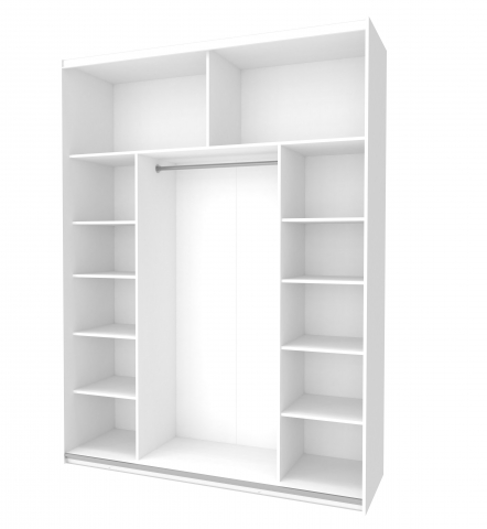 шафа містить три відділення: з боків розташовані відділення з полицями, в центральній частині – штанга для вішалок, зверху полиці антресоль |