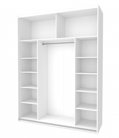шафа містить три відділення: з боків розташовані відділення з полицями, в центральній частині – штанга для вішалок, зверху полиці антресоль |