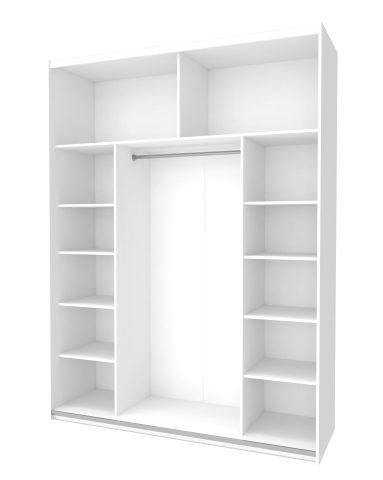 шафа містить три відділення: з боків розташовані відділення з полицями, в центральній частині – штанга для вішалок, зверху полиці антресоль |