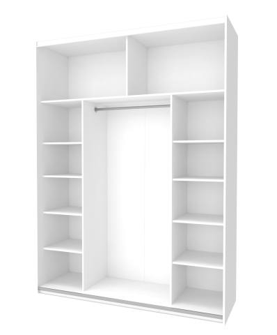 шафа містить три відділення: з боків розташовані відділення з полицями, в центральній частині – штанга для вішалок, зверху полиці антресоль |