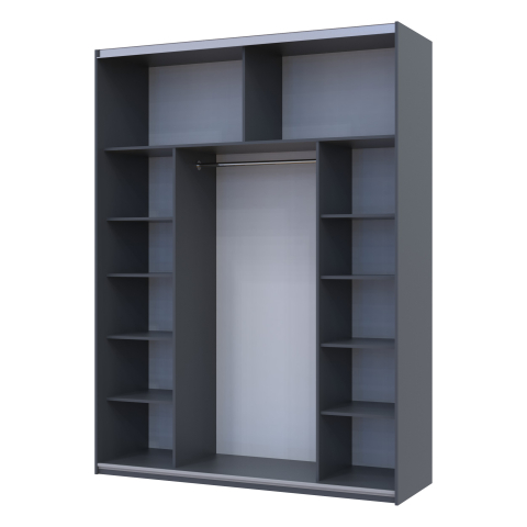 шафа містить три відділення: з боків розташовані відділення з полицями, в центральній частині – штанга для вішалок, зверху полиці антресоль |