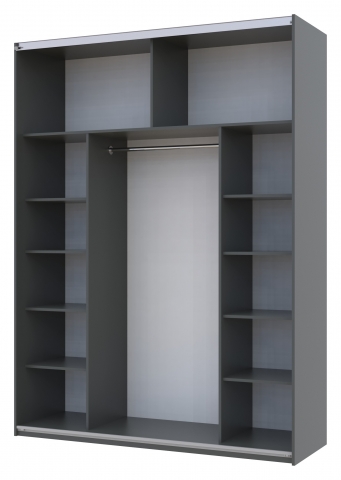 шафа містить три відділення: з боків розташовані відділення з полицями, в центральній частині – штанга для вішалок, зверху полиці антресоль |