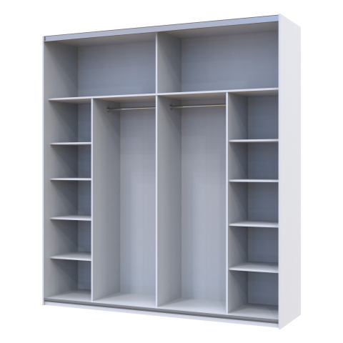 шафа містить чотири відділення: з боків розташовані відділення з полицями, в центральній частині два відділення зі штангою для вішалок, зверху полиці антресоль |