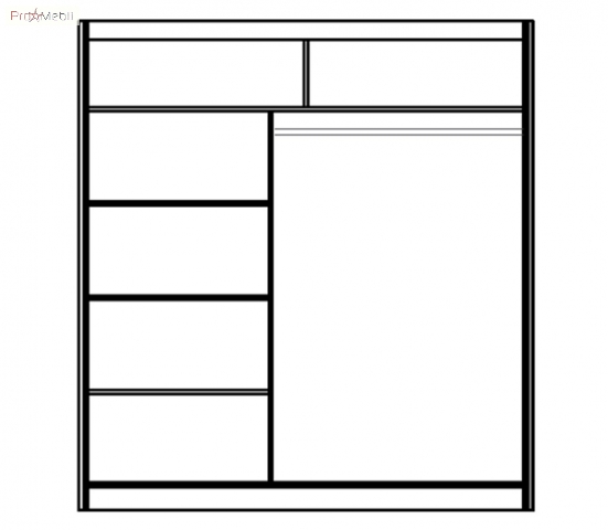 шафа містить два відділення: ліворуч розташовано чотири полиці, праворуч – полиця і штанга для вішалок |