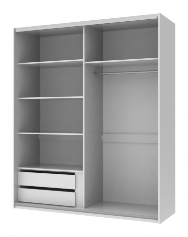шафа містить два відділення: в одному відділенні розташовані полиці та висувні шухляди, в іншому – полиця і штанга для вішалок |