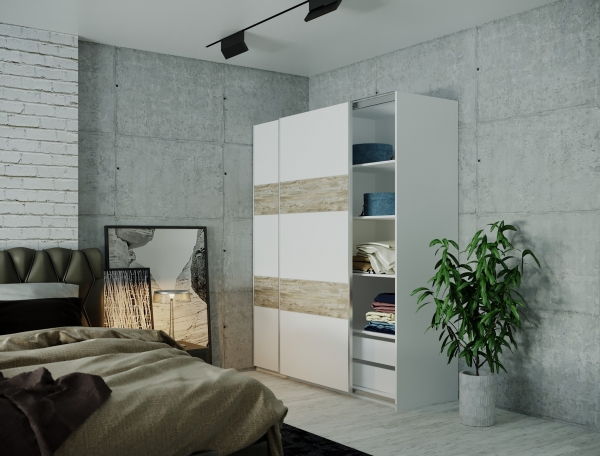Шафа-купе L-Caiser Doros – це невід'ємна і функціональна складова сучасного інтер'єру спальні чи вітальні, гардеробної кімнати або передпокою, для створення «правильного планування» та зберігання речей. Перевагою шафи є два відділення: в одному відділенні розташовані полиці та висувні шухляди з роликовими направляючими, в іншому – полиця і штанга для вішалок та сучасна навісна розсувна система, виконана з використанням надійних механізмів від провідного німецького виробника, а естетичну красу доповнюють горизонтально розташовані подвійні декоративні вставки із натуральними фактурами дерева. Шафа-купе L-Caiser Doros безсумнівно, стане модним, функціональним і практичним предметом меблів в зоні Вашого комфорту.
