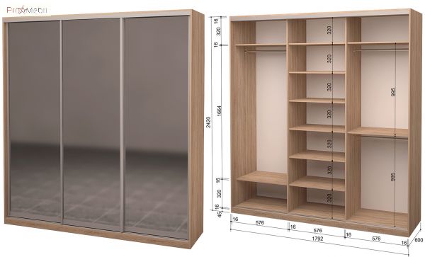 Шафа-купе Roko - вибір якості від української фабрики серед шаф, яка гармонійно впишеться в Ваш інтер'єр і створить затишок завдяки великій гамі кольорів, різних розмірів і міцних матеріалів. Шафа-купе складається з трьох розсувних дзеркальних дверей. Усередині справа дві штанги для вішалок і дві полиці, зліва - одна штанга і дві полиці, по центру шість полиць завдяки чому Ви можете розмістити всі необхідні речі. Шафа-купе Roko представлена в широкому діапазоні відтінків: дуб венге, дуб Сонома, дуб молочний, німфея альба, сірий графіт, що дозволяє меблям легко вписатися в різні дизайни, наповнивши квартиру шармом і натхненням.