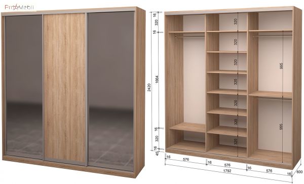 Шафа-купе Roko - вибір якості від української фабрики серед шаф, яка гармонійно впишеться в Ваш інтер'єр і створить затишок завдяки великій гамі кольорів, різних розмірів і міцних матеріалів. Шафа-купе складається з трьох розсувних дверей: одна з ДСП, дві дзеркальні. Усередині справа дві штанги для вішалок і дві полиці, зліва - одна штанга і дві полиці, по центру шість полиць завдяки чому Ви можете розмістити всі необхідні речі. Шафа-купе Roko представлена в широкому діапазоні відтінків: дуб венге, дуб Сонома, дуб молочний, німфея альба, сірий графіт, що дозволяє меблям легко вписатися в різні дизайни, наповнивши квартиру шармом і натхненням.