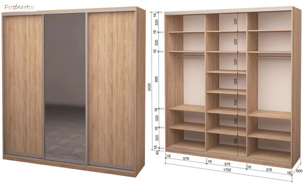 Шафа-купе Roko - це надійна модель серед шаф, яка гармонійно впишеться в Ваш інтер'єр і створить затишок завдяки великій гамі кольорів, різних розмірів і міцних матеріалів. Шафа-купе складається з трьох розсувних дверей: дві з ДСП, одна дзеркальна. Усередині справа одна штанга для вішалок і чотири полиці, зліва - так само, а по центру шість полиць завдяки чому Ви можете розмістити всі необхідні речі. Шафа-купе Roko представлена в широкому діапазоні відтінків: дуб венге, дуб Сонома, дуб молочний, німфея альба, сірий графіт, що дозволяє меблям легко вписатися в різні дизайни, наповнивши квартиру шармом і натхненням.