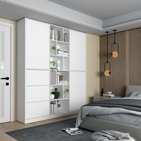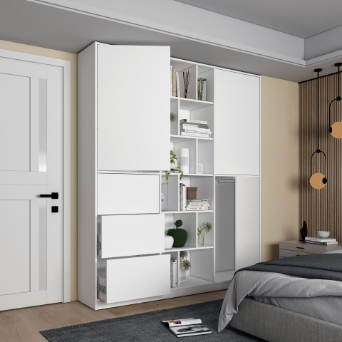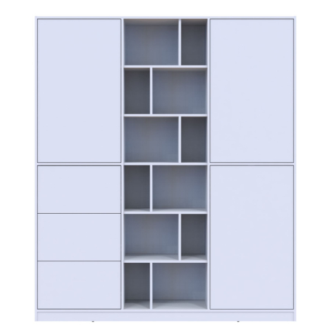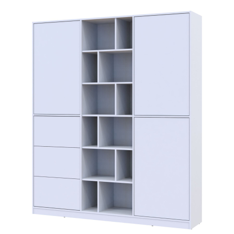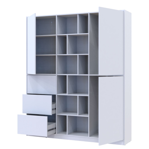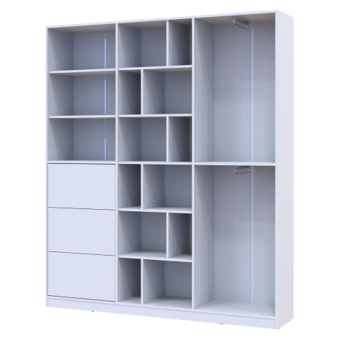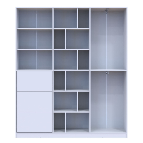 шафа містить п’ять відділень: одне відділення з трьома висувними шухлядами, одне відділення з закритими полицями, два відділення зі штангою для вішалок та одне відділення з відритими полицями |