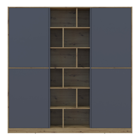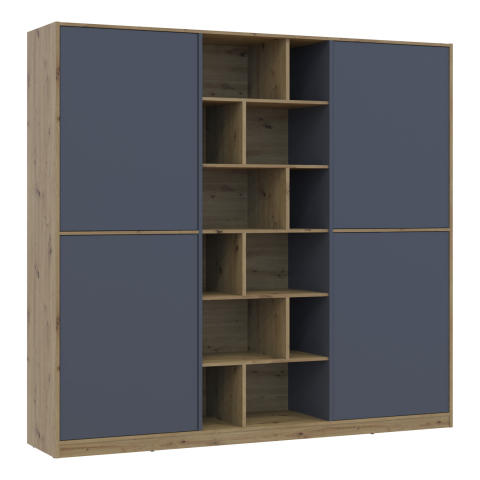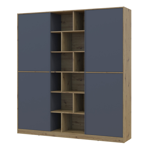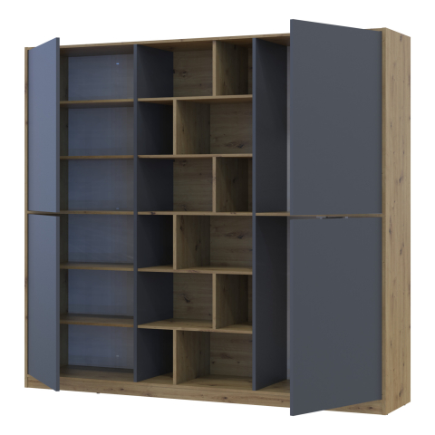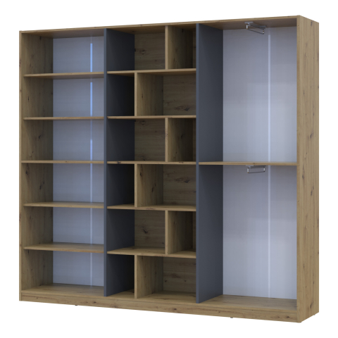шафа містить п’ять відділень: два відділення з закритими полицями, два відділення зі штангою для вішалок та одне відділення з відритими полицями |