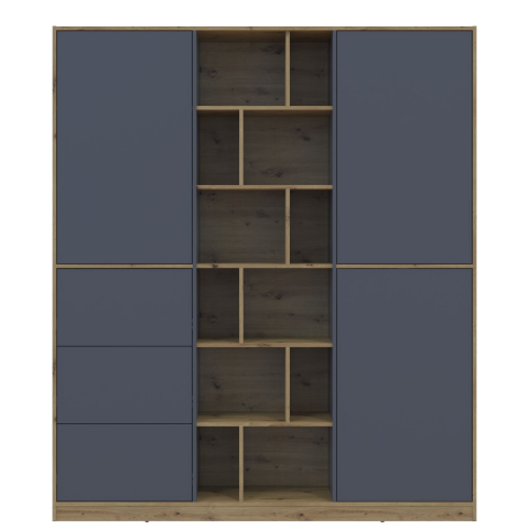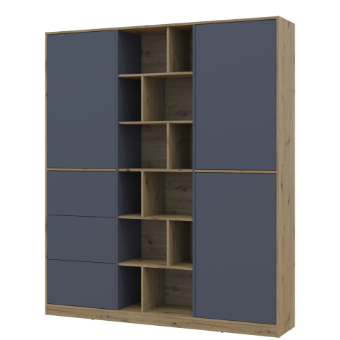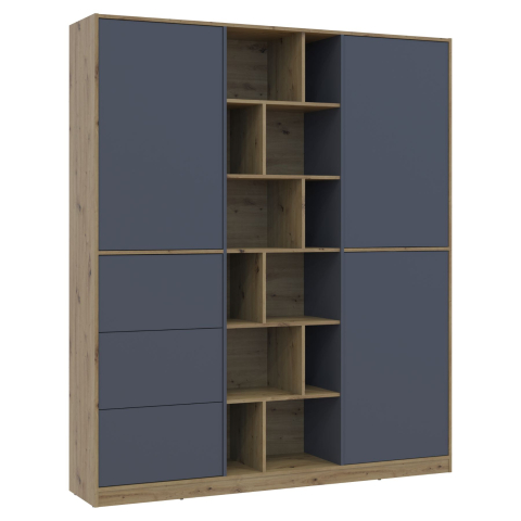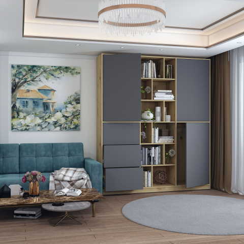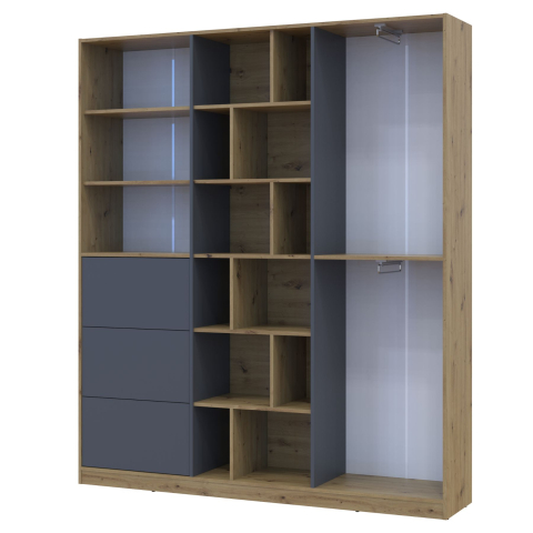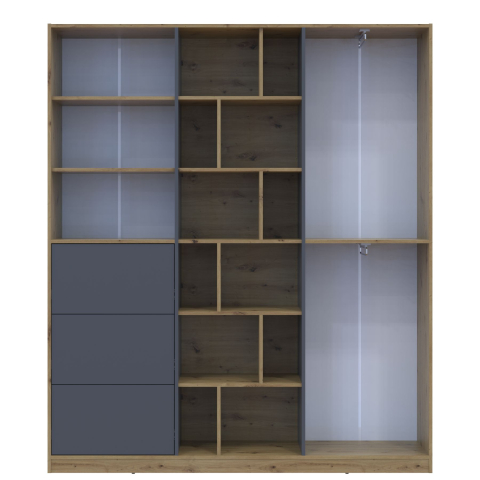 шафа містить п’ять відділень: одне відділення з трьома висувними шухлядами, одне відділення з закритими полицями, два відділення зі штангою для вішалок та одне відділення з відритими полицями |