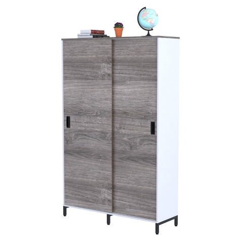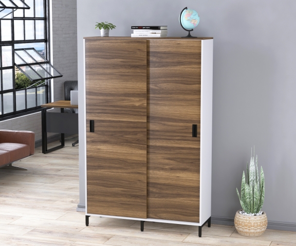 Офісна шафа LS-1200-1900 німфея альба від компанії Loft Design – це сучасний та стильний предмет інтер'єру. Відмінною особливістю цієї моделі є розсувні двері, які відчиняються за принципом "шафи-купе". Така конструкція надає шафі сучасного вигляду, а також дозволяє використовувати її у вузьких коридорах або на проході. Двоколірне забарвлення шафи загострює увагу на фасадах виготовлених з ДСП з гарним забарвленням і в той же час відводить погляд від громіздкого корпусу. Шафа LS-1200-1900 оснащена металевими опорами, виготовленими із квадратної труби 25*25 мм. Метал пофарбований у чорний матовий колір за технологією порошкового фарбування, стійкою до стирання. Опори комплектуються регульованими ніжками, які дозволяють виставити тумбу на нерівній підлозі. Корпус шафи виконаний з ламінованого ДСП кольору німфея альба. Двері та верхня кришка виготовляється у кольорах: венге луїзіана, горіх модена, дуб крафт золотий, дуб палена. Врізні ручки чорного матового кольору відмінно гармонують із металевими елементами, а також не заважають повному відкриванню дверей. Двері шафи оснащені розсувним механізмом: внизу встановлюються колеса, а зверху напрямні, що ходять алюмінієвими рейками. Двері фіксуються у закритому положенні за допомогою стопорів. Внутрішнє наповнення шафи може бути тільки з одними полицями, так і з відділеннями з тремпелями для одягу. Шафа LS-1200-1900 антрацит чудово підходить для офісних приміщень. Висота полиць розрахована для того, щоб на них містилися сегрегатори, коробки з офісним папером.