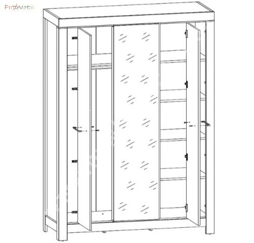 шафа містить два закриті відділення: з лівого боку за двома дверцятами встановлені полиця та штанга для вішалок, з правого – чотири полиці |