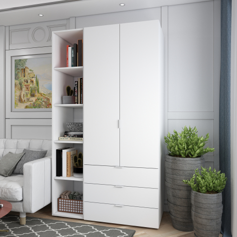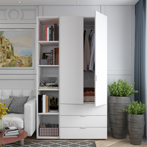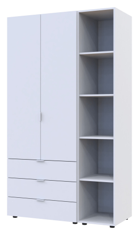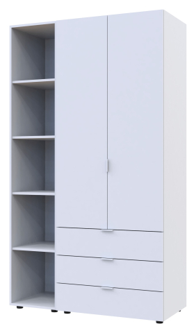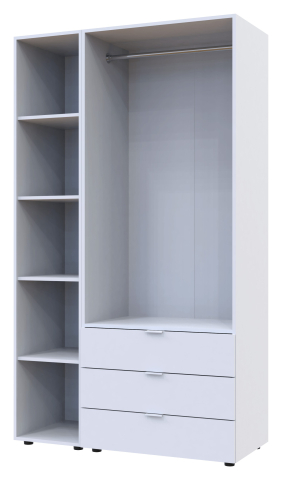 шафа містить три відділення: відділення з трьома висувними шухлядами, відділення зі штангою для вішалок та відділення з відритими полицями |