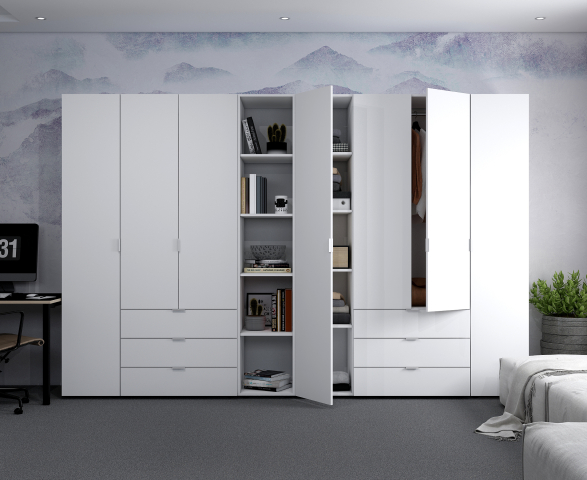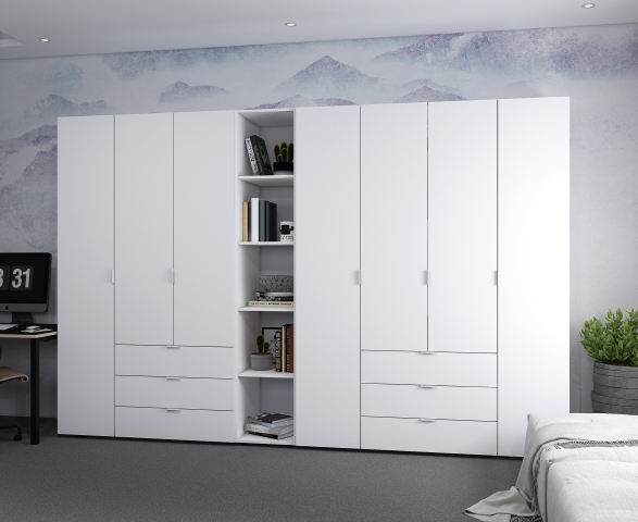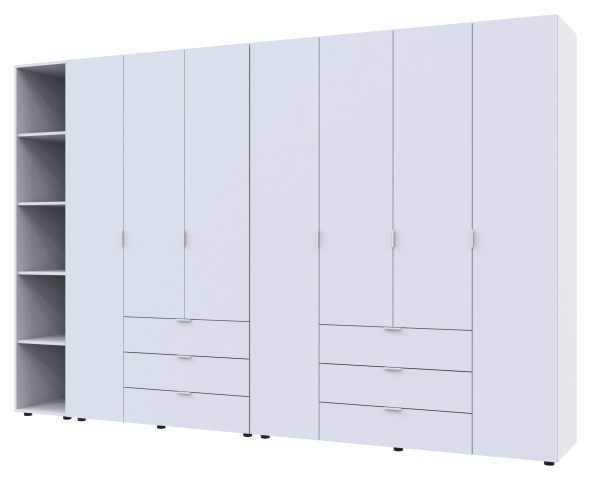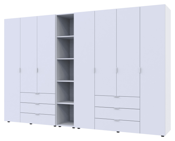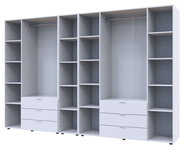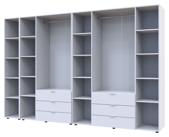шафа містить вісім відділень: два відділення з трьома висувними шухлядами, три відділення з закритими полицями, два відділення зі штангою для вішалок та одне відділення з відритими полицями |