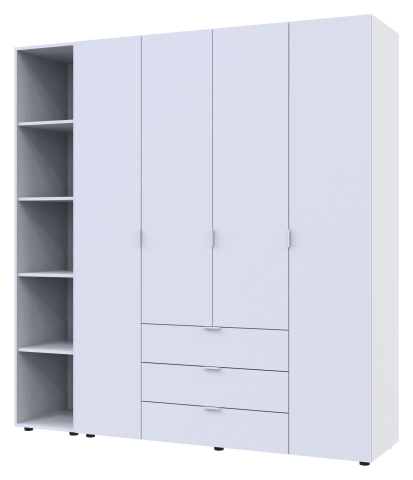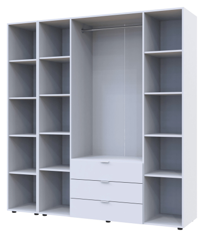 шафа містить п’ять відділення: відділення з трьома висувними шухлядами, два відділення з закритими полицями, відділення зі штангою для вішалок та одне відділення з відритими полицями |