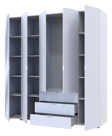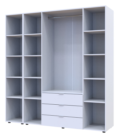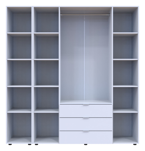 шафа містить п’ять відділень: відділення з трьома висувними шухлядами, відділення зі штангою для вішалок та три відділення з полицями |