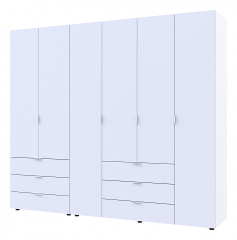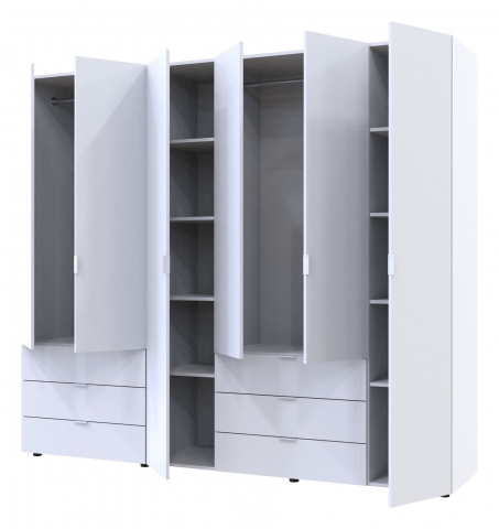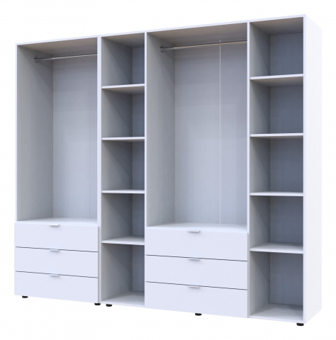 шафа містить шість відділень: два відділення з трьома висувними шухлядами, два відділення з полицями та два відділення зі штангою для вішалок |