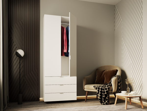 Шафа для одягу Гелар 2 ДСП Doros - це ідеальний вибір для збереження Вашого гардеробу. Внутрішнє наповнення представлене відділом зі штангою для підвішування одягу та функціональними шухлядами для зручного зберігання всіх необхідних речей та аксесуарів. Шафа виготовлена з екологічно чистого ламінованого ДСП (Kronospan) товщиною 16 мм, торцеві поверхні облицьовані кромкою ПВХ товщиною 0,5 мм, з надійною меблевою фурнітурою - петлями та роликовими направляючими, які прослужать довго, а ергономічна накладна пластикова ручка полегшить експлуатацію виробу. Шафа для одягу Gelar Doros допоможе ергономічно та функціонально організувати простір Вашого приміщення, оформивши його в сучасному стилі.