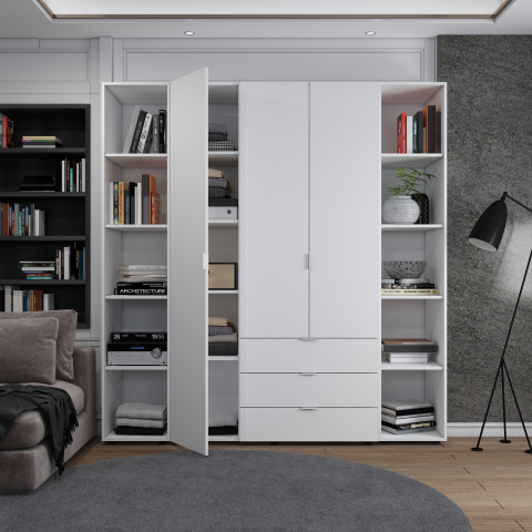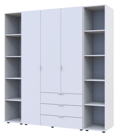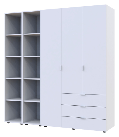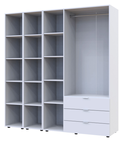 шафа містить п’ять відділень: відділення з трьома висувними шухлядами, відділення зі штангою для вішалок та три відділення з полицями |