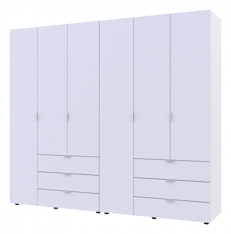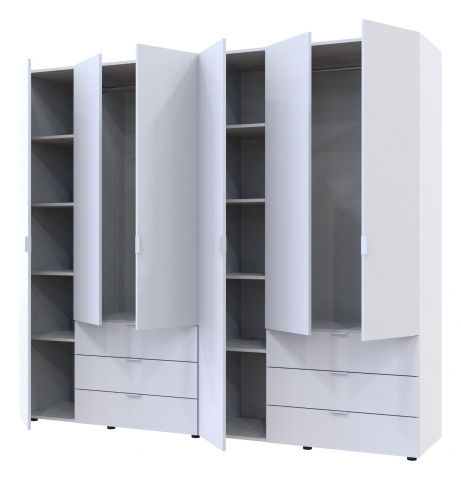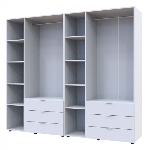шафа містить шість відділень: два відділення з трьома висувними шухлядами, два відділення з полицями та два відділення зі штангою для вішалок |