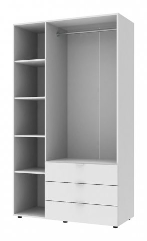 шафа містить три відділення: відділення з трьома висувними шухлядами, відділення з полицями та відділення зі штангою для вішалок |