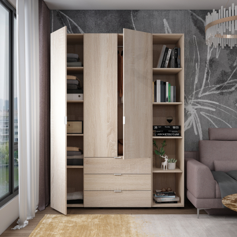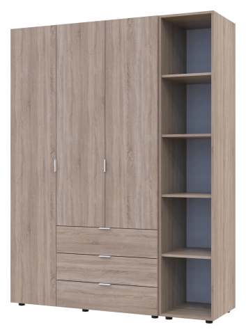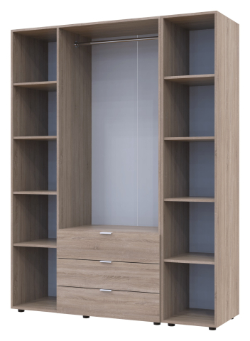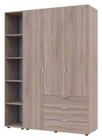 шафа містить чотири відділення: відділення з трьома висувними шухлядами, відділення з закритими полицями, відділення зі штангою для вішалок та одне відділення з відритими полицями |