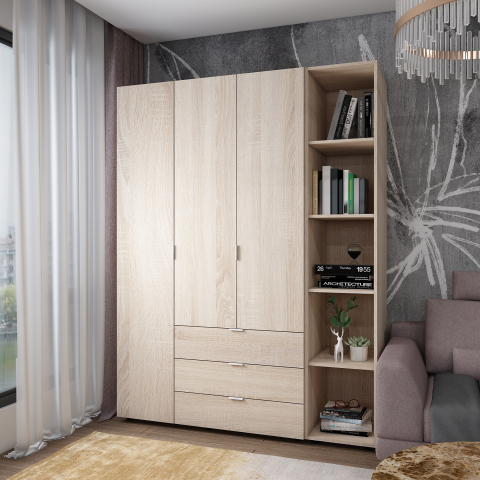 Шафа для одягу Гелар 1 етажерка / 3 ДСП Doros - це ідеальний вибір для збереження Вашого гардеробу. Внутрішнє наповнення представлене відділенням зі штангою для підвішування одягу, секція з закритими місткими поличками, функціональними шухлядами та одним відділенням з відкритими полицями для зручного зберігання всіх необхідних речей та аксесуарів. Шафа виготовлена з екологічно чистого ламінованого ДСП (Kronospan) товщиною 16 мм, торцеві поверхні облицьовані кромкою ПВХ товщиною 0,5 мм, з надійною меблевою фурнітурою - петлями та роликовими направляючими, які прослужать довго, а ергономічна накладна пластикова ручка полегшить експлуатацію виробу. Шафа для одягу Gelar Doros допоможе ергономічно та функціонально організувати простір Вашого приміщення, оформивши його в сучасному стилі.