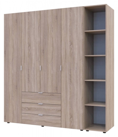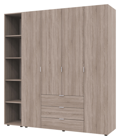 Шафа для одягу Гелар 1 етажерка / 4 ДСП Doros - це ідеальний вибір для збереження Вашого гардеробу. Внутрішнє наповнення представлене відділенням зі штангою для підвішування одягу, двома секціями з закритими місткими поличками, функціональними шухлядами та одним відділенням з відкритими полицями для зручного зберігання всіх необхідних речей та аксесуарів. Шафа виготовлена з екологічно чистого ламінованого ДСП (Kronospan) товщиною 16 мм, торцеві поверхні облицьовані кромкою ПВХ товщиною 0,5 мм, з надійною меблевою фурнітурою - петлями та роликовими направляючими, які прослужать довго, а ергономічна накладна пластикова ручка полегшить експлуатацію виробу. Шафа для одягу Gelar Doros допоможе ергономічно та функціонально організувати простір Вашого приміщення, оформивши його в сучасному стилі.