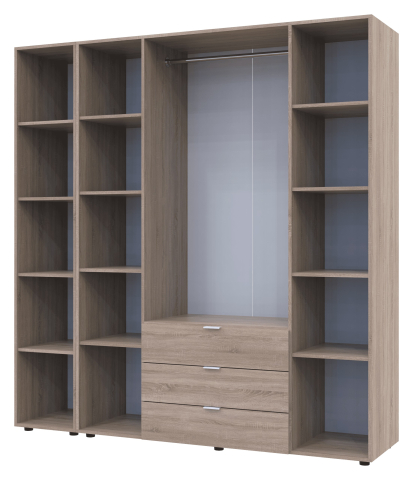 шафа містить п’ять відділення: відділення з трьома висувними шухлядами, два відділення з закритими полицями, відділення зі штангою для вішалок та одне відділення з відритими полицями |