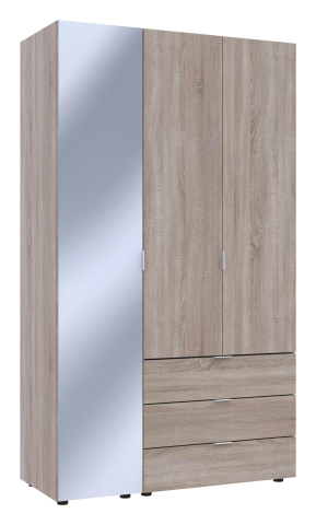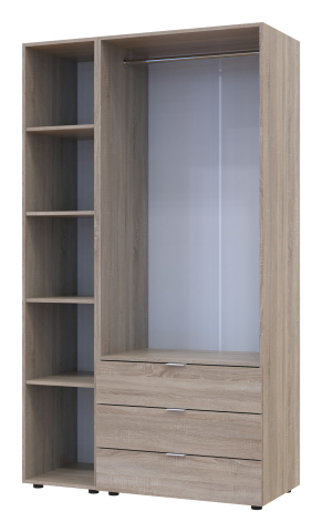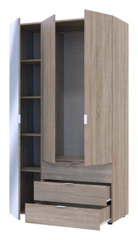 шафа містить три відділення: відділення з трьома висувними шухлядами, відділення зі штангою для вішалок та відділення з полицями |