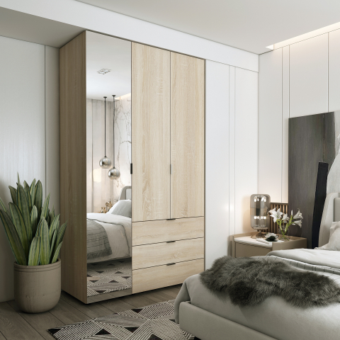 Платтяна шафа Гелар 1 дзеркало / 2 ДСП Doros ідеальна для тих, хто цінує порядок і зручність. Завдяки продуманій конструкції та якісним матеріалам, вона стане незамінним елементом вашого інтер'єру, забезпечуючи зручне зберігання одягу та аксесуарів. Шафа містить три відділення: відділення з трьома висувними шухлядами для зберігання білизни, аксесуарів і дрібних речей, відділення зі штангою для вішалок - ідеальне для верхнього одягу, суконь, костюмів та інших речей, які потребують вертикального зберігання, а також відділення з полицями - придатне для зберігання взуття, сумок, складних речей та інших предметів. Дзеркало на фасаді шафи дасть змогу швидко оцінити Ваш зовнішній вигляд, не виходячи зі спальні або гардеробної. Платтяна шафа Гелар - прекрасний вибір для тих, хто цінує організованість і хоче, щоб всі речі знаходилися на своїх місцях.