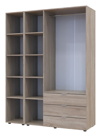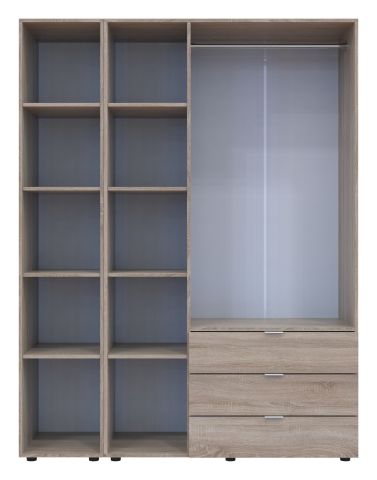 шафа містить чотири відділення: відділення з трьома висувними шухлядами, відділення зі штангою для вішалок та два відділення з полицями |