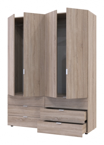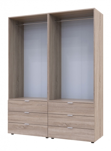 шафа містить чотири відділення: два відділення з трьома висувними шухлядами та два відділення зі штангою для вішалок |