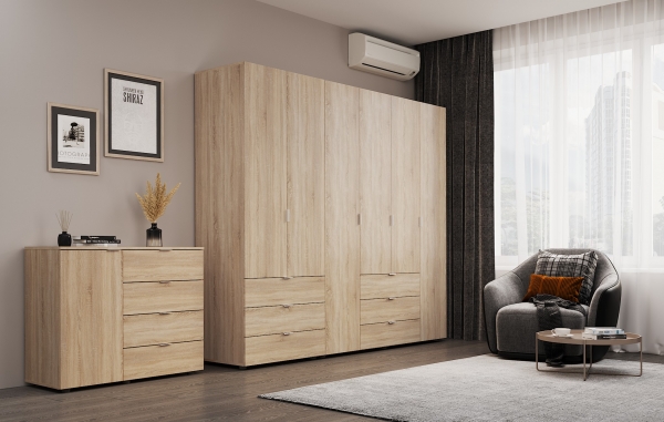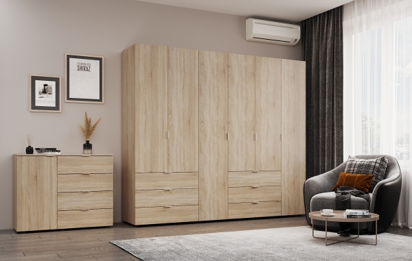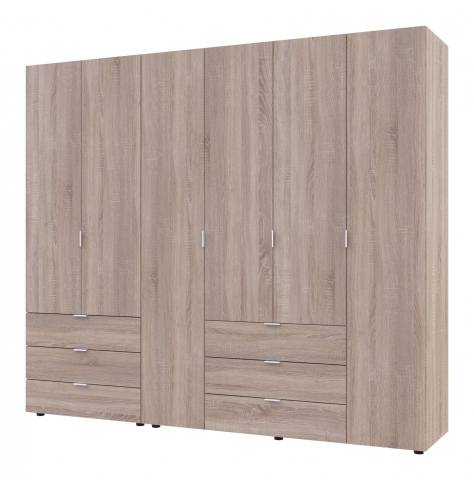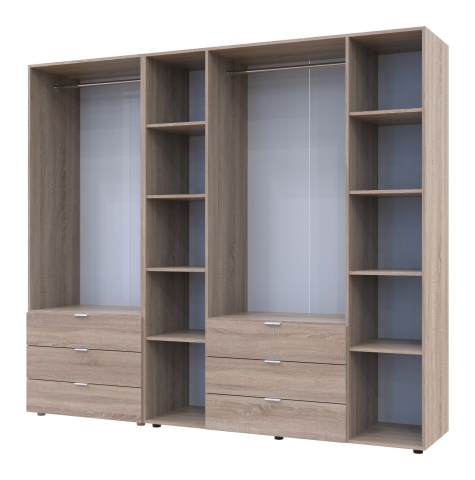 шафа містить шість відділень: два відділення з трьома висувними шухлядами, два відділення з полицями та два відділення зі штангою для вішалок |