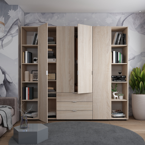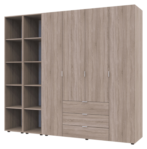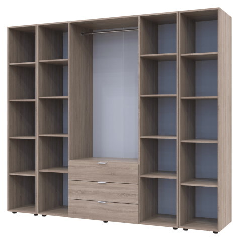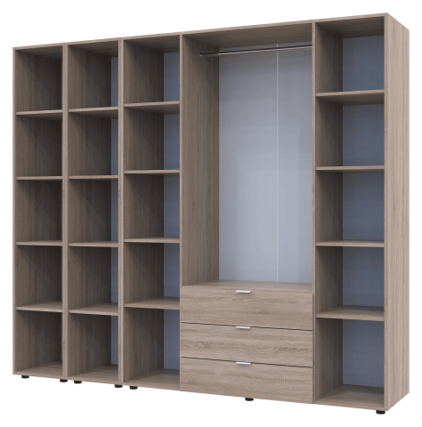 шафа містить шість відділень: відділення з трьома висувними шухлядами, відділення зі штангою для вішалок та чотири відділення з полицями |