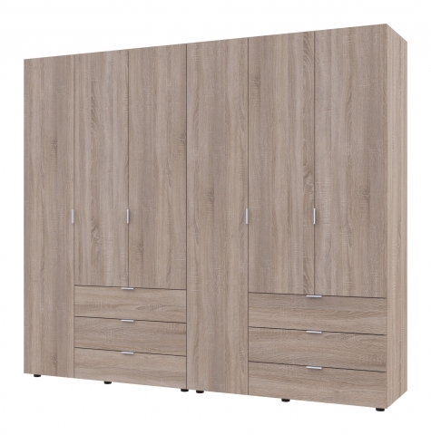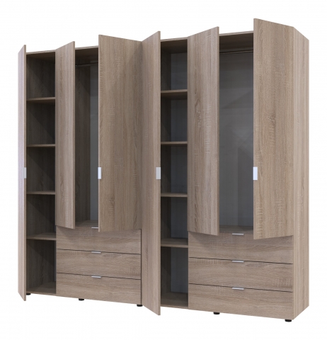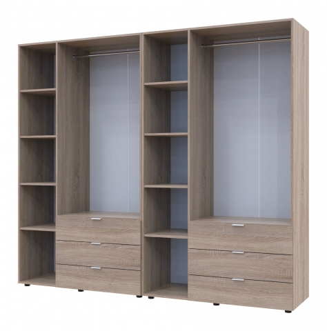 шафа містить шість відділень: два відділення з трьома висувними шухлядами, два відділення з полицями та два відділення зі штангою для вішалок |
